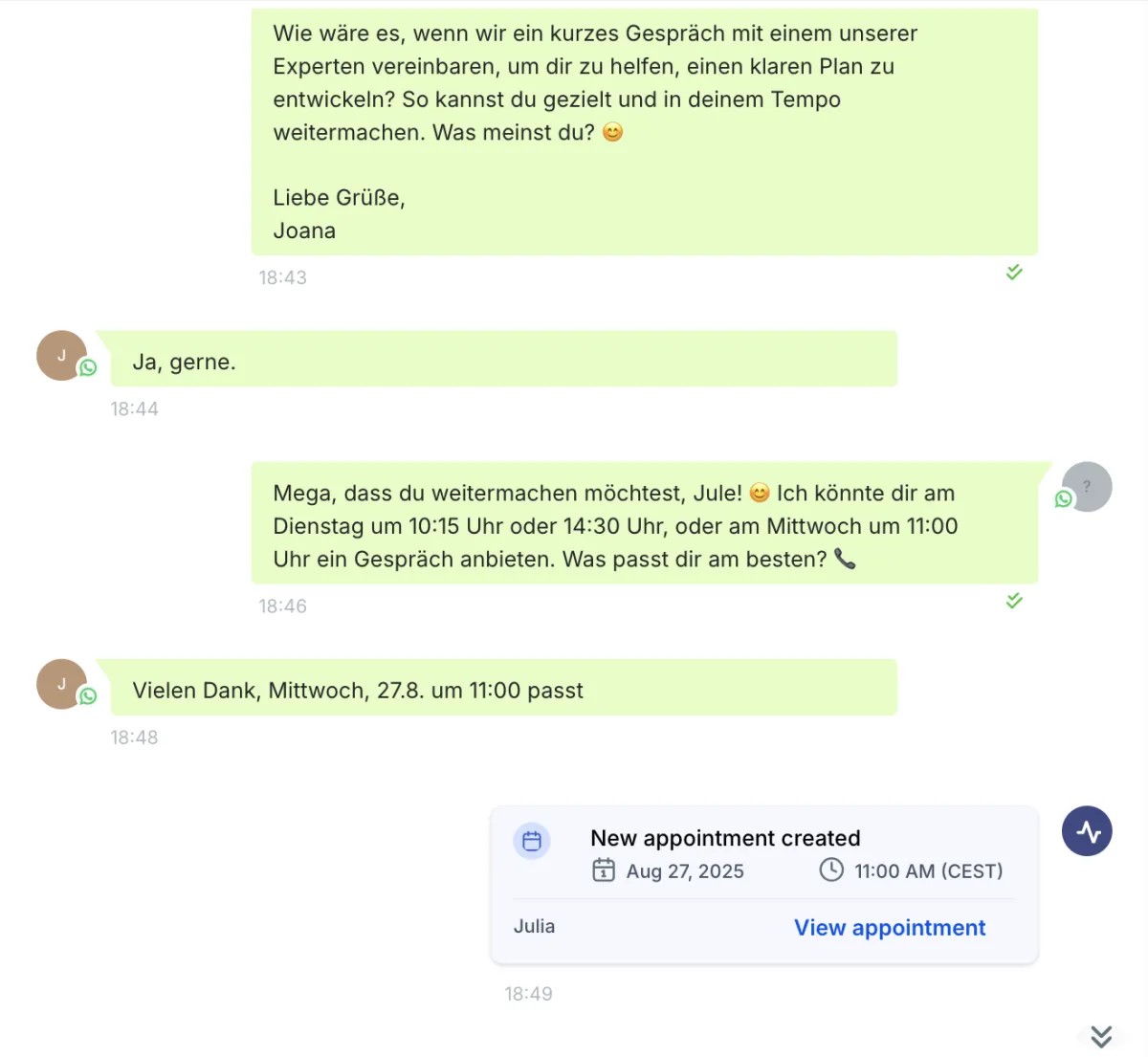 In 97% der Fälle qualifiziert und bucht die KI den Lead korrekt. Sollte es ein Problem geben, haben wir Überwachungs- und Fallbacksysteme, bei denen ein Mensch eingreifen könnte.