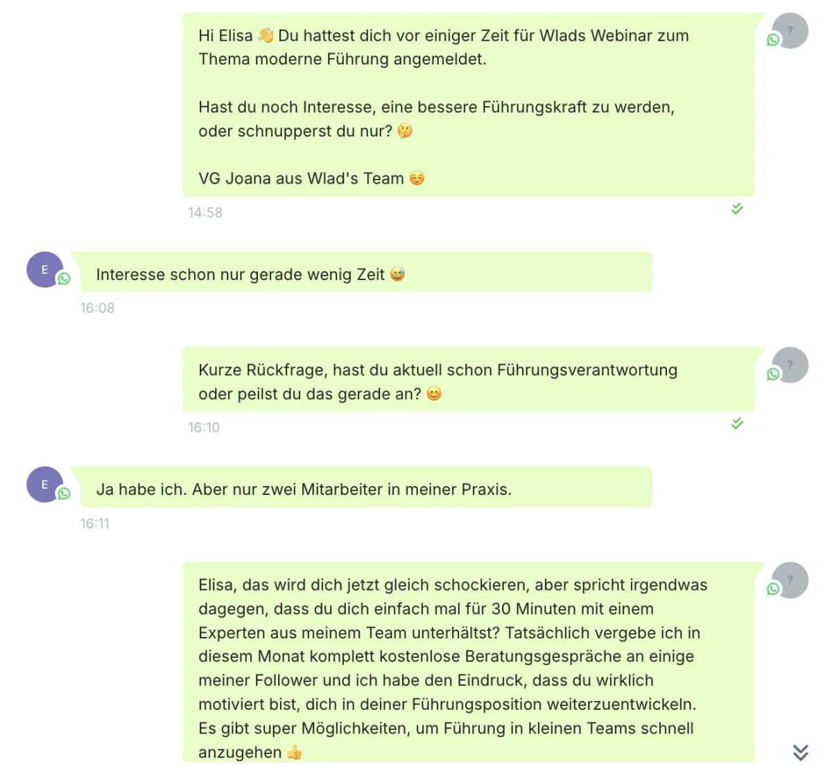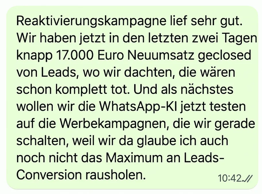 Die Reaktivierungskampagne ist der perfekte Weg um deinem Business eine Cash Spritze zu verpassen. Die WhatsApp KI kann deine "toten" Leads kontaktieren, wieder aufwärmen und einbuchen.